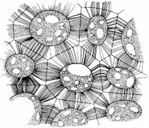2.胞间连丝(plasmodesmata) 相邻两个细胞之间有许多纤细的原生质丝,穿过初生壁上的微细孔眼彼此联系,这种原生质丝称胞间连丝。在电子显微镜下观察,胞间连丝为直径30~60nm的孔道,孔道中有内质网连接到相邻细胞内质网系统,有利于细胞间特定物质运输和信号传递。有的植物具有较明显的胞间连丝,经染色处理后可在光学显微镜下观察到,如柿子核和马钱子的胚乳细胞(图11-4)。