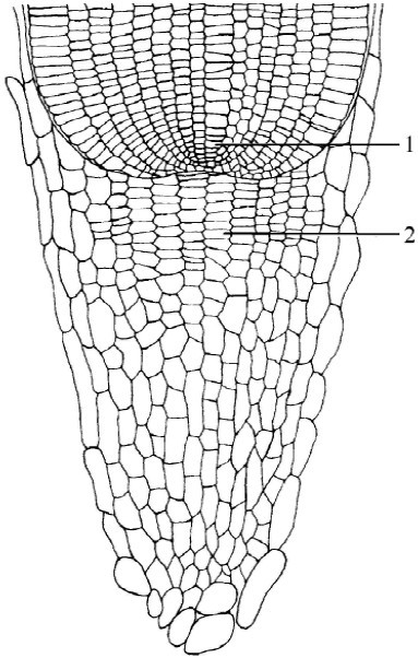 直接来源于种子的胚,由胚遗留下的终生保持分裂能力的胚性细胞所组成,通常位于植物根、茎的顶端,又称顶端分生组织(apical meristem)。其分裂活动的结果,使根、茎不断地伸长和长高(图2-1)。