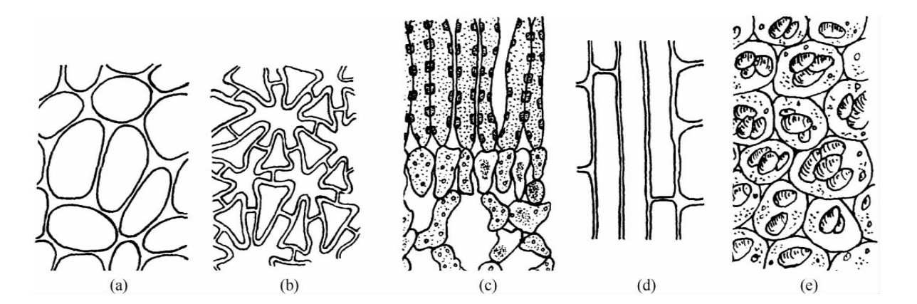 (a)一般薄壁组织 (b)通气薄壁组织 (c)同化薄壁组织 (d)输导薄壁组织 (e)储藏薄壁组织