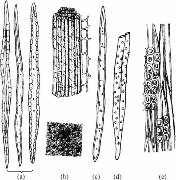 (a)单纤维 (b)纤维束 (c)姜的分隔纤维(d)南五味子根的嵌晶纤维 (e)甘草的晶纤维