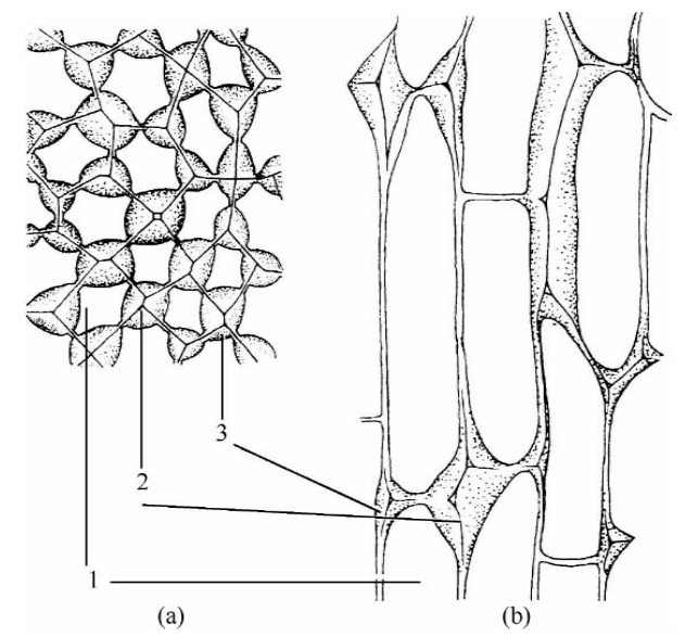(a)横切面 (b)纵切面1.细胞腔 2.胞间层 3.增厚的壁