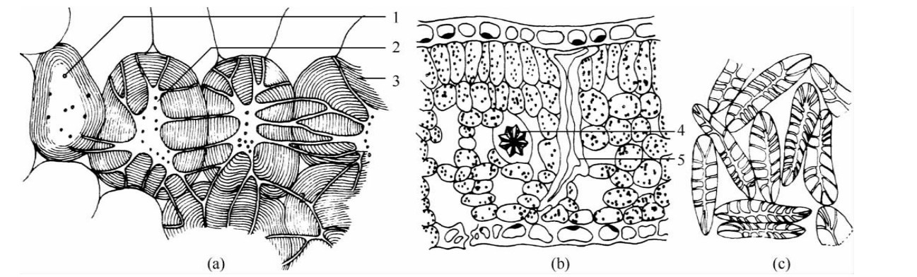 (a)梨的石细胞 (b)茶叶横切面 (c)椰子果皮内的石细胞1.纹孔 2.细胞腔 3.层纹 4.草酸钙结晶 5.畸形石细胞