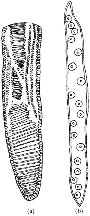 综合分析上述五种导管类型,环纹导管、螺纹导管直径较细,输导能力较差,多存在于植物体幼嫩器官中,可随植物体的生长而伸长;梯纹、网纹、孔纹导管直径较粗,输导能力较强,多存在于植物体成熟器官中,这些导管次生壁的比例较大,不易随植物的生长而伸长,且导管壁木质化程度较高,有很强的机械强度,能抵抗周围组织的压力。