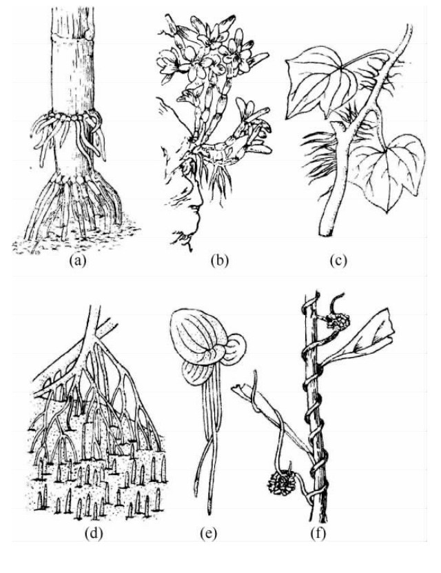 (a)支柱根(玉米) (b)气生根(石斛) (c)攀援根(常春藤) (d)呼吸根(红树) (e)水生根(青萍) (f)寄生根(菟丝子)