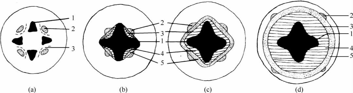 (a)幼根的情况:初生木质部在成熟中,虚线表示形成层 (b)形成层已连成连续组织,初生部分已产生次生结构,初生韧皮部已受挤压 (c)形成层全部产生次生结构,但仍为凹凸不平的形象,初生韧皮部受挤压更甚 (d)形成层已成完整的圆环1.初生木质部 2.初生韧皮部 3.形成层 4.次生木质部 5.次生韧皮部