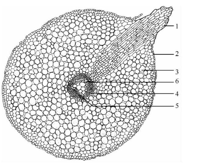 1.表皮 2.导管 3.皮层 4.维管柱鞘5.根毛 6.原形成层