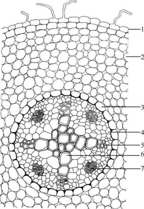 1.表皮 2.皮层 3.内皮层 4.中柱鞘5.原生木质部 6.后生木质部 7.韧皮部