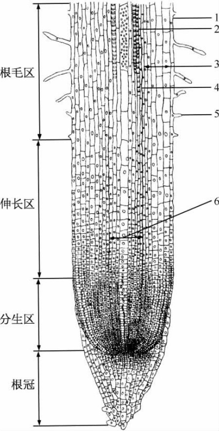根尖(root tip)是指根的最顶端到着生根毛的幼嫩部分。无论主根、侧根、不定根均具有根尖。根的伸长、对水分与养料的吸收以及成熟组织的形成与分化均在此区域进行,是根中生命活动最旺盛、最重要的部分,根尖的任何损伤会直接影响根的生长发育。根据外部构造和内部组织分化的不同,将根尖划分为四个部分,从下至上依次为根冠、分生区、伸长区和成熟区,但各区域之间没有明显的界线(图3--4)。