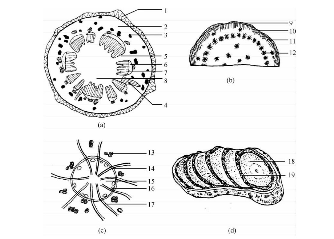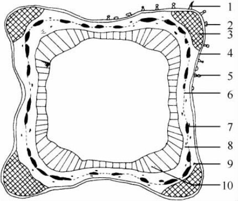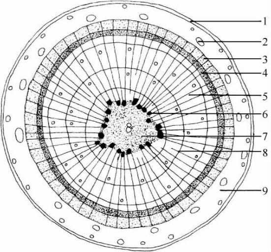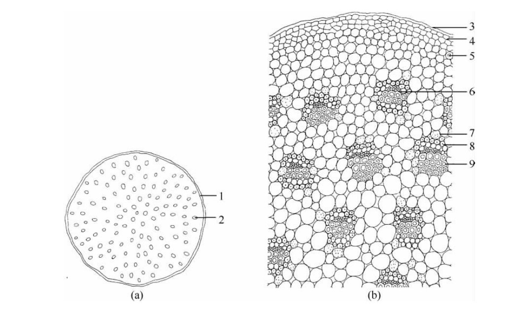 (a)石斛茎的横切面简图 (b)石斛茎的横切面详图1.表皮 2.维管束 3.角质层 4.表皮 5.皮层 6.韧皮部 7.薄壁细胞 8.纤维束 9.木质部