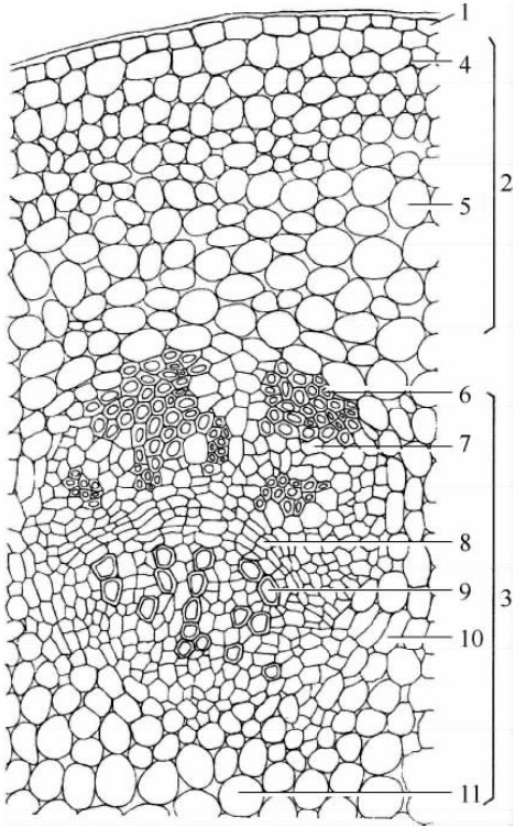 1.表皮 2.皮层 3.维管柱 4.厚角组织5.薄壁组织 6.韧皮纤维 7.初生韧皮部8.束中形成层 9.初生木质部10.髓射线 11.髓
