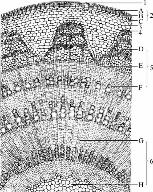 1.表皮 2.周皮 3.皮层 4.韧皮纤维5.维管束 6.髓A.木栓层 B.木栓形成层 C.栓内层D.韧皮部 E.形成层 F.木质部G.射髓 H.中髓