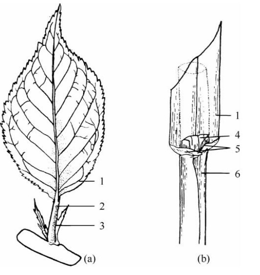 (a)完全叶 (b)禾本科植物的叶1.叶片 2.叶柄 3.托叶4.叶舌 5.叶耳 6.叶鞘