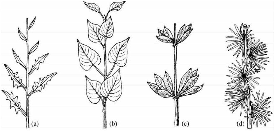 (a)互生叶序 (b)对生叶序 (c)轮生叶序 (d)簇生叶序