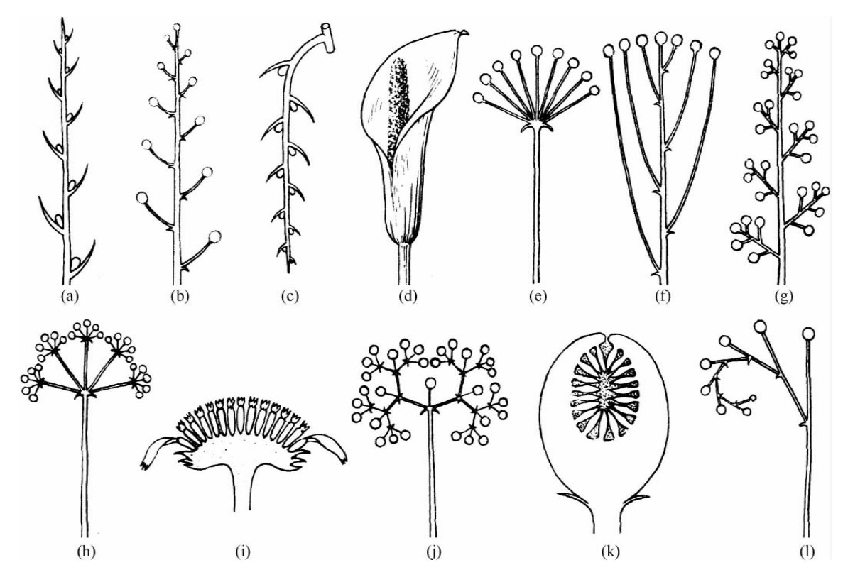 (a)穗状花序 (b)总状花序 (c)柔荑花序 (d)肉穗花序 (e)伞形花序 (f)伞房花序 (g)圆锥花序(h)复伞形花序 (i)头状花序 (j)二歧聚伞花序 (k)隐头花序 (l)螺旋状聚伞花序