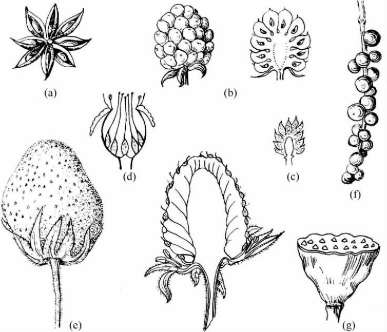 一朵花中有多数离生单雌蕊聚集生长在花托上,每一个雌蕊发育成一个单果,并与花托共同发育成的果实称聚合果(aggregate fruit)。根据单果的类型不同,聚合果又可分为多种类型,如八角茴香、芍药、厚朴为聚合蓇葖果,草莓、毛茛为聚合瘦果,悬钩子为聚合核果,五味子为聚合浆果,莲为聚合坚果(图3--57)。