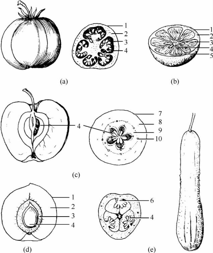 (a)浆果 (b)柑果 (c)梨果 (d)核果 (e)瓠果1.外果皮 2.中果皮 3.内果皮 4.种子 5.毛囊 6.胎座7.表皮层 8.花托的皮层 9.果皮 10.花托的维管束