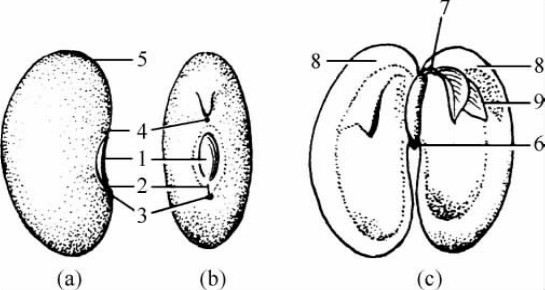 (a)菜豆正面 (b)菜豆侧面 (c)菜豆的组成部分1.种脐 2.种脊 3.合点 4.种孔 5.种皮 6.胚根 7.胚轴 8.子叶 9.胚芽