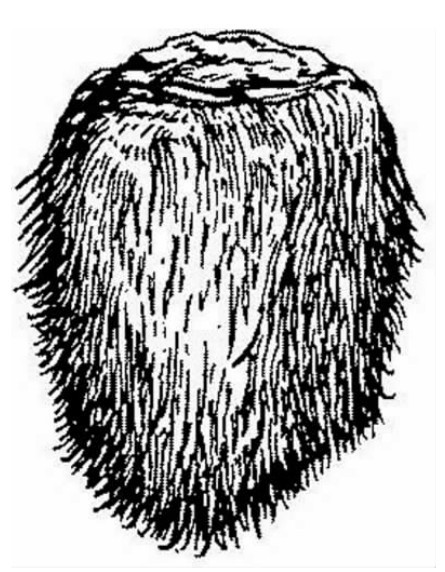 猴头菌Hericium erinaceus(Bull.ex Fr.)Pers.属齿菌科。子实体肉质,鲜时白色,干后浅褐色,块状,似猴头,基部狭窄,除基部外,均布肉质针状刺,刺直、下垂,长1~6cm,粗1~2mm。孢子球形至近球形,直径5~6μm(图6-7)。分布于东北、华北、西北、西南等省区。生于栎、胡桃等阔叶树种的立木及朽木上,现也有栽培。猴头为名贵滋补品和美味食用菌,药用子实体具利五脏助消化功效,因含多糖及多种氨基酸,具抗肿瘤作用和增强免疫功能。