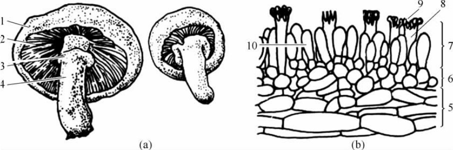 (a)伞菌(蘑菇) (b)菌褶纵切面1.菌盖 2.菌褶 3.菌环 4.菌柄 5.菌髓 6.子实层基7.子实层 8.担子柄 9.担孢子 10.侧丝细胞