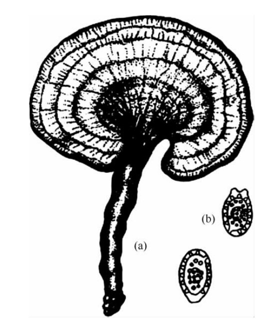 灵芝Ganoderma lucidum(Leyss.ex Fr.)Karst.属多孔菌科。子实体木质或木栓质,菌盖半圆形或肾形,初期黄色,渐变红褐色,有明显的油漆样光泽,有环状棱纹和辐射状皱纹,边缘薄或平截,稍内卷,菌盖下面白色至浅褐色,具很多小孔。菌柄侧生,稀偏生,通常与菌盖呈直角,与菌盖同颜色,亦具漆样光泽。孢子褐色,卵形,中央含1个大油滴(图6-9)。分布于华东、西南及河北、山西、河南、广东、广西、台湾等地。生于栎树及其他阔叶对干基部或根部,现已人工培育。药用子实体,具滋补强壮,安神解毒功效,子实体含有还原糖、多糖、氨基酸、蛋白质、甾类、三萜类、内酯、香豆精苷,生物碱等成分,灵芝孢子粉具有抗癌作用。同属植物紫芝G.japonicum(Fr)Lloyd菌盖及菌柄黑色,表面光亮如漆。分布于河北、山东、浙江、江西、福建、湖南、广东、广西、云南等省区。生于腐木桩上。子实体入药,作灵芝用。