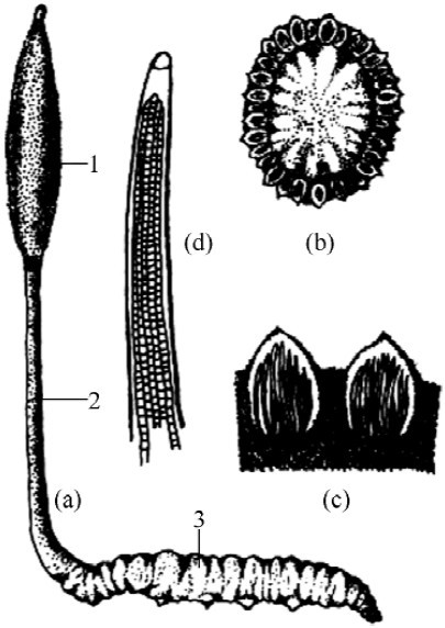 (a)菌体全形 (b)子座横切面,示子囊壳(c)子囊壳(子实体)放大 (d)子囊及子囊孢子1.子座上部 2.子座柄 3.已死虫体