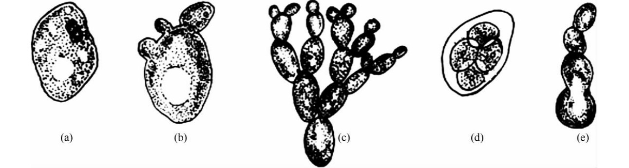 (a)单个细胞 (b)出芽 (c)芽细胞相连成串 (d)子囊孢子的形成 (e)子囊孢子萌芽,产生新个体