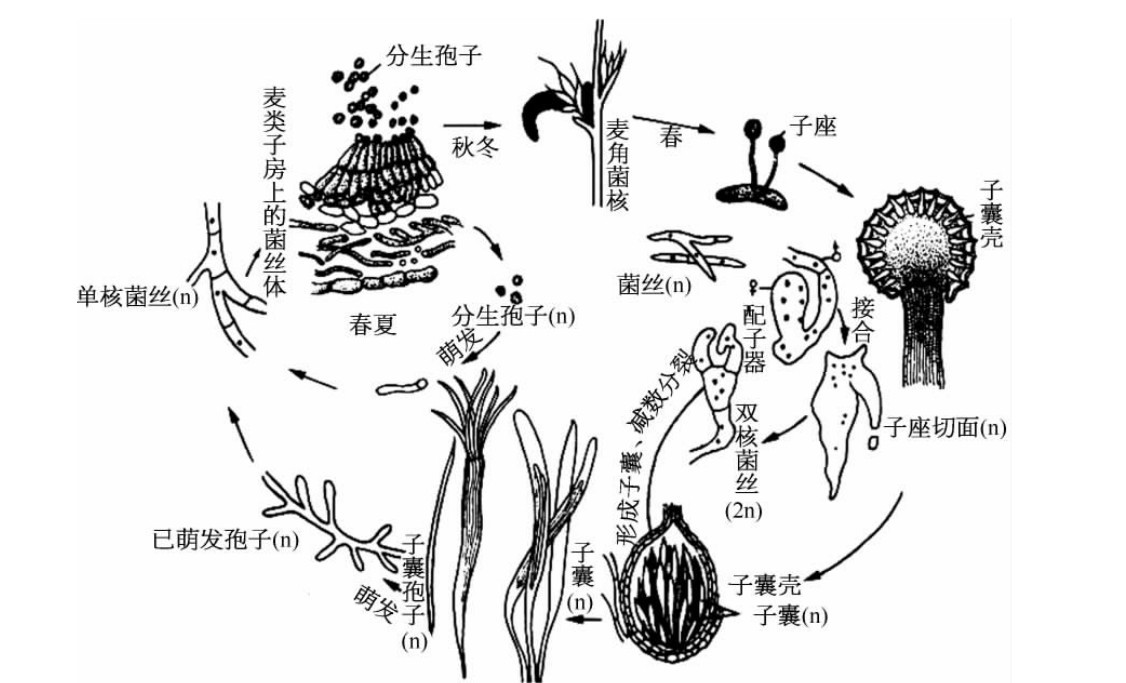 麦角菌Clavicepspur purea(Fr.)Tul.为麦角菌科植物,寄生在禾本科植物的子房内。主要以麦类黑麦为主。在黑麦开花期,麦角菌的子囊孢子线状,单细胞,借风力传到雌蕊的柱头上,立刻发生芽管侵入子房中。菌丝在子房内滋长,逐渐突破子房壁,形成大量分生孢子。同时菌丝体分泌黏液,引诱昆虫将分生孢子带到健康花上,麦角病因之传播。当黑麦即成熟时,受害的子房不再产生分生孢子,渐渐收缩成团,变成紫黑色坚硬的菌核,形状像动物的角,称麦角(ergot)。麦角挥落土中越冬或混入种子中,再随种子播入土中,第二年春黑麦开花时,菌核萌发生出许多红头紫柄的子座。每一菌核可生出20~30个柄细、多弯曲,暗褐色,头部近球形的子座。子囊壳全部埋生于子座内,孔口稍伸出子座的表面,其内长有许多长圆柱形的子囊,每子囊内有8个线形的子囊孢子,孢子散出后,借助于气流雨水或昆虫,传播到麦穗的雌蕊上,萌发成芽管侵入子房(图6-3)。