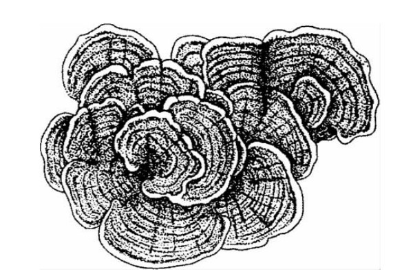 云芝Coriolus versicolor(L.ex Fr.)Quel.属多孔菌科。子实体无柄,菌盖覆瓦状排列,革质,有细长毛或绒毛,颜色多种,有光滑狭窄的同心环带,边缘薄,波状,菌肉白色。孢子圆筒形(图6-11)。全国大部分地区均有分布。生于柳、杨、白桦、栎、榛、枫杨、李、桃、紫丁香等阔叶树的朽木(树干)上。子实体入药,能清热、消炎。子实体含有多糖,用于治疗肝炎、肿瘤等症。