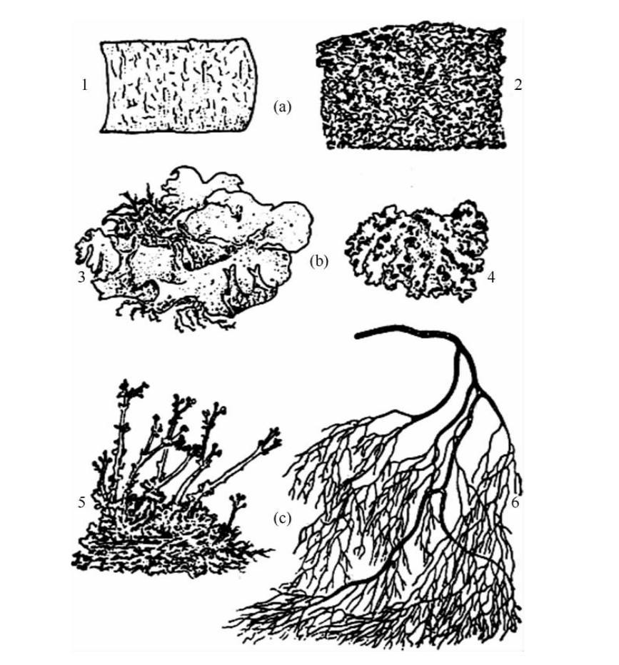 (a)壳状地衣 (b)叶状地衣 (c)枝状地衣1.文字衣属 2.茶渍衣属 3.地卷衣属 4.梅衣属 5.石蕊属 6.松萝属