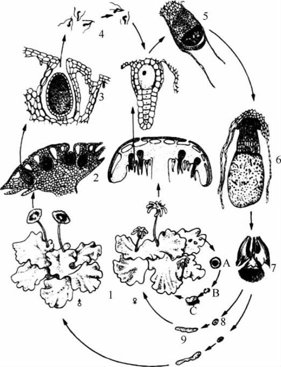 1.雌雄配子体 2.雌器托和雄器托 3.颈卵器及精子器4.精子 5.受精卵发育成胚 6.孢子体7.孢子体成熟后散发孢子 8.孢子 9.原丝体A.胞芽杯内胞芽成熟 B.胞芽脱离母体 C.胞芽发育成新植物体