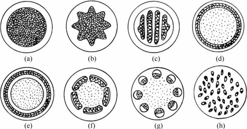(a)单中柱 (b)星状中柱 (c)编织中柱 (d)外韧管状中柱(e)双韧管状中柱 (f)网状中柱 (g)真中柱 (h)散状中柱