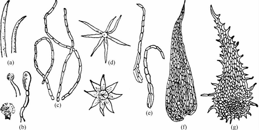 (a)单细胞毛 (b)腺毛 (c)节状毛 (d)星状毛 (e)鳞片 (f)细筛孔鳞片 (g)粗筛孔鳞片