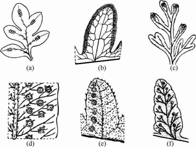(a)无盖孢子囊群 (b)边生孢子囊群 (c)顶生孢子囊群 (d)有盖孢子囊群(e)脉背生孢子囊群 (f)脉端生孢子囊群