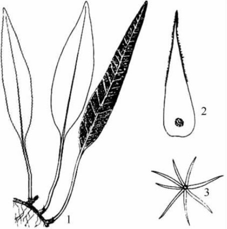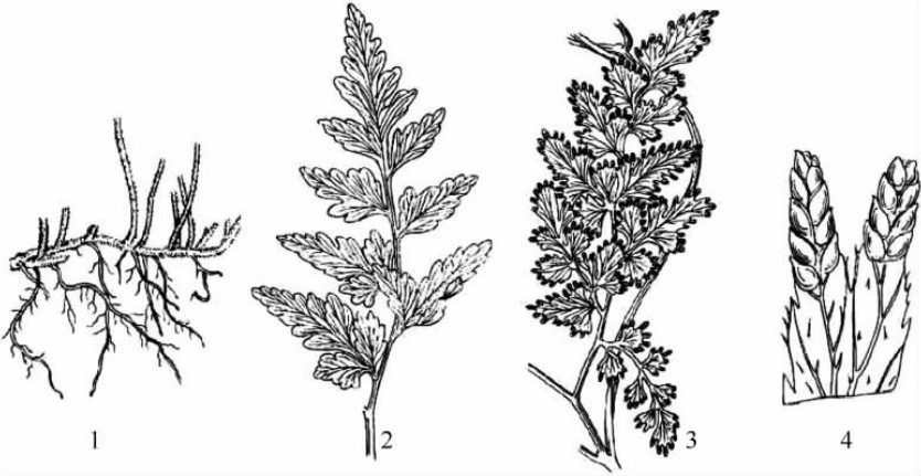 1.植物全株 2.叶片的一部分,示叶脉及孢子囊群位置 3.地上茎的鳞片