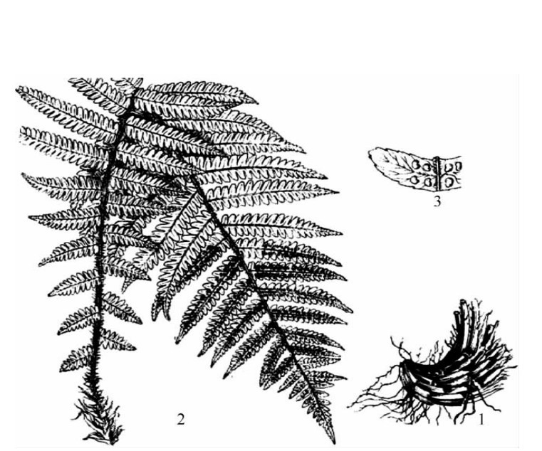 粗茎鳞毛蕨(绵马鳞毛蕨、东北贯众)Dryopteris crassirhizoma Nakai为多年生草本。根茎大,斜生,密生棕褐色长披针形大鳞片。叶簇生于根茎顶端,叶柄自基部直达叶轴密生棕色鳞片,倒披针形,二回羽状分裂,裂片密接,长圆形,近全缘或先端有钝锯齿,侧脉羽状分叉。孢子囊群分于叶中部以上的羽片上,生于叶背小脉中部以下,每裂片2~4对;囊群盖圆肾形,棕色(图9-16分布于东北及华北部分地区。生于山地阴坡,林下湿地。具有清热、解毒、抗炎、抑菌、驱虫、止血作用;主治虫积(绦虫、十二指肠虫病),子宫功能性出血,流感,流行性脑脊髓膜炎,麻疹,热毒疮等症。