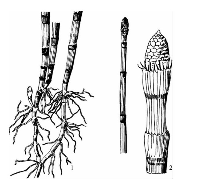 2.植物体具明显的节和节间,叶退化成鳞片状,不能进行光合作用,孢子具弹丝 ………………………………………………………………………………楔叶亚门Sphenophytina