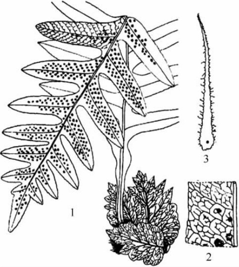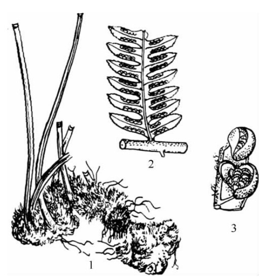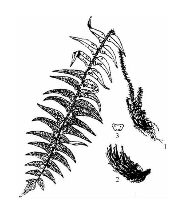 1.根状茎 2.叶 3.羽片一部分,示孢子囊群