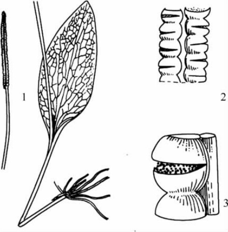 瓶尔小草Ophioglossum vulgatum L.为多年生小草本,直立,高12~26cm。根状茎短,圆柱形,有一簇肉质根。叶单生,总柄深埋土中,营养叶从总柄基部以上6~9cm处生出,无柄,全缘,肉质,网状脉明显,中脉两侧的二次细脉约与中脉平行。孢子囊穗自总柄顶端发出,远超出营养叶,窄条形,顶端有小突起(图9-12)。分布于东北、西北、西南等地。生于林下和山坡阴凉稍潮湿的土中,怕高温。全草入药,具有凉血、清热解毒、消肿止痛的作用。