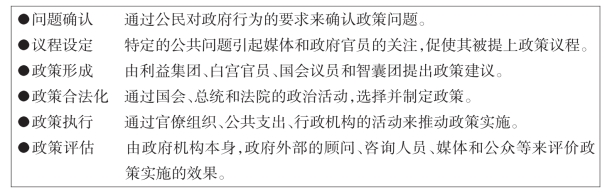 过程途径对于我们理解政策制定过程中的各种活动是很有帮助的。我们需要明白政策制定包括:议程设定(吸引决策者的关注)、政策形成(设计并选择政策)、政策合法化(寻求政治支持,获得国会、总统或法院的批准)、政策执行(建立官僚机构、财政支出、施行法律)、政策评估(探寻政策是否有效,是否受到人们支持)。