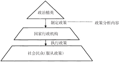 公共政策研究的精英途径从政治学精英理论出发,认为政策反映的是精英的偏好、价值观和利益,而不是群众的要求;政策的变化或完善实际上是精英们的价值变化的结果;群众对于政策是麻木不仁的,不知情的。政策实际上变成领袖的按自己的偏好作选择,而政府不过是执行领袖们做出选择的机构;政策是自上而下由领袖提出并加以执行,而不是自下而上产生于群众的要求(见图1.2)。