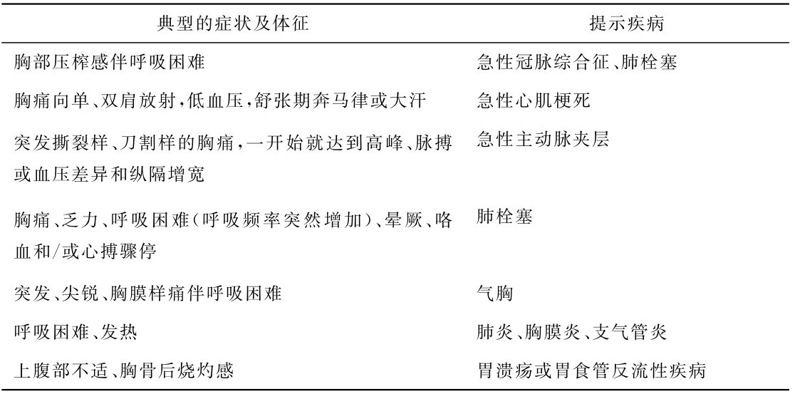 1.采集病史 病人的年龄、性别,以及吸烟、糖尿病、高脂血症、高血压等病史和家族史,对于评估病人的胸痛病因至关重要。须关注疼痛的部位、范围、性质,疼痛发生的时间、加重或缓解因素等,还应询问伴随症状,如憋喘、出汗、心悸、眩晕、恶心、呕吐等。例如,典型的心肌缺血导致的胸痛位于胸骨后,呈憋闷、压榨性、紧缩感或烧灼感等,可放射至颈部、下颌、上腹部、肩部或左前臂,一般持续2~10min,休息或含服硝酸甘油后3~5min内可缓解,诱发因素包括劳累、运动、饱餐、寒冷、情绪激动等。与呼吸或咳嗽有关的锐痛或刀割样痛常见于肺栓塞、肺炎、心包炎等胸膜炎性胸痛;局限于左心尖或肋骨软骨交界处的疼痛且伴有按压痛,常提示肋软骨炎;位于胸骨后或上腹部,与饮酒、进食等有关,常提示消化系统疾病。
