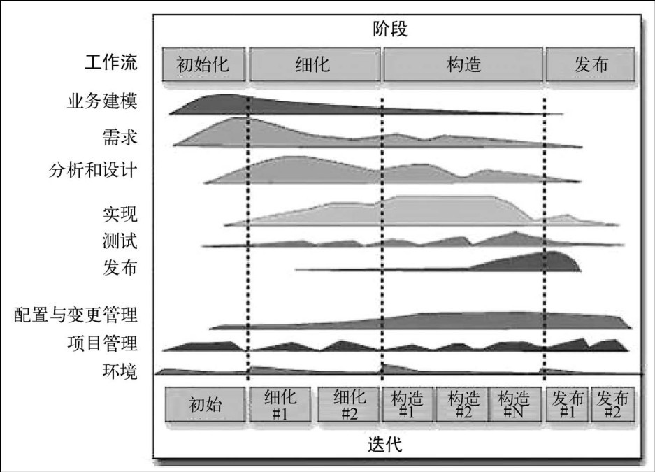 在每个阶段,都将围绕用例展开多轮迭代。在每一次迭代中都将涉及各个工作流中的活动,产生交付物甚至是可验证的原型。当然,在不同阶段中,涉及各个工作流的比重是有区别的。图2-2中每个工作流对应的波浪线就反映了在不同阶段中的工作量比例。