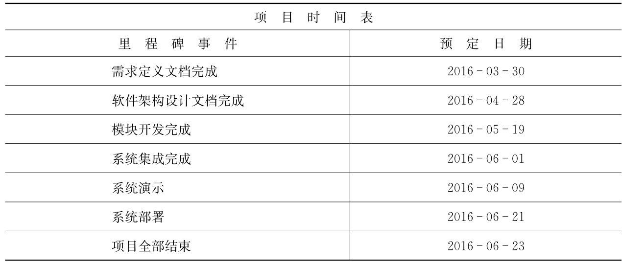 用一张表(项目时间表)列出所有重要发布点、演示及其他里程碑事件的预定日期。
