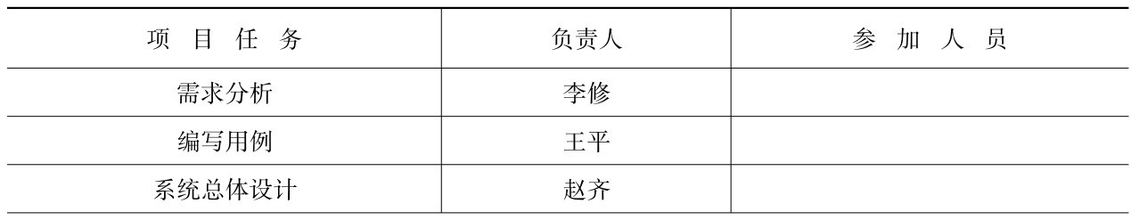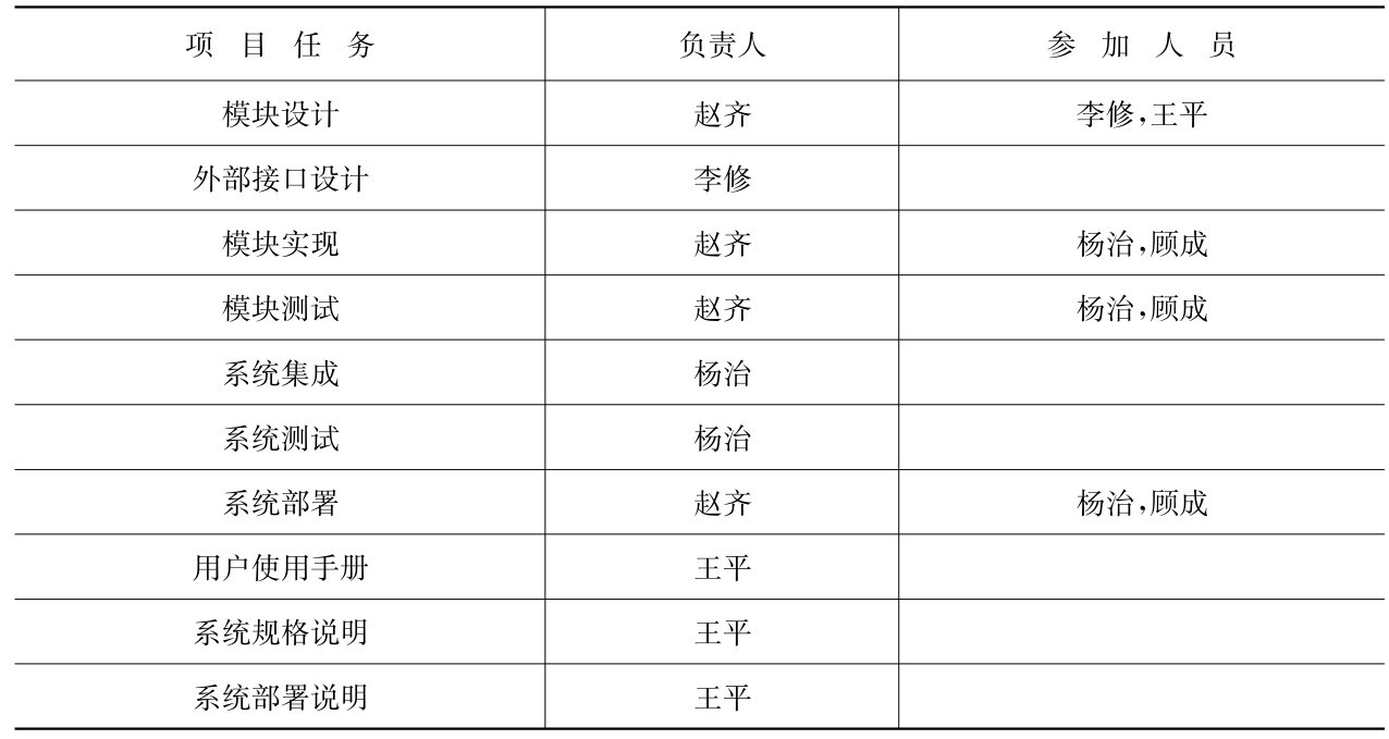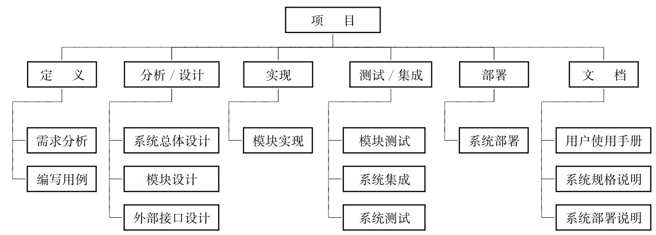 对于项目开发中需要完成的各项工作,从需求分析、设计、实现、测试直到维护,包括文件的编制、审批、打印、分发工作,用户培训工作,软件安装工作等,按层次进行分解,用图示说明工作分解结构,并且用列表的形式列明每项任务的负责人和参加人员。