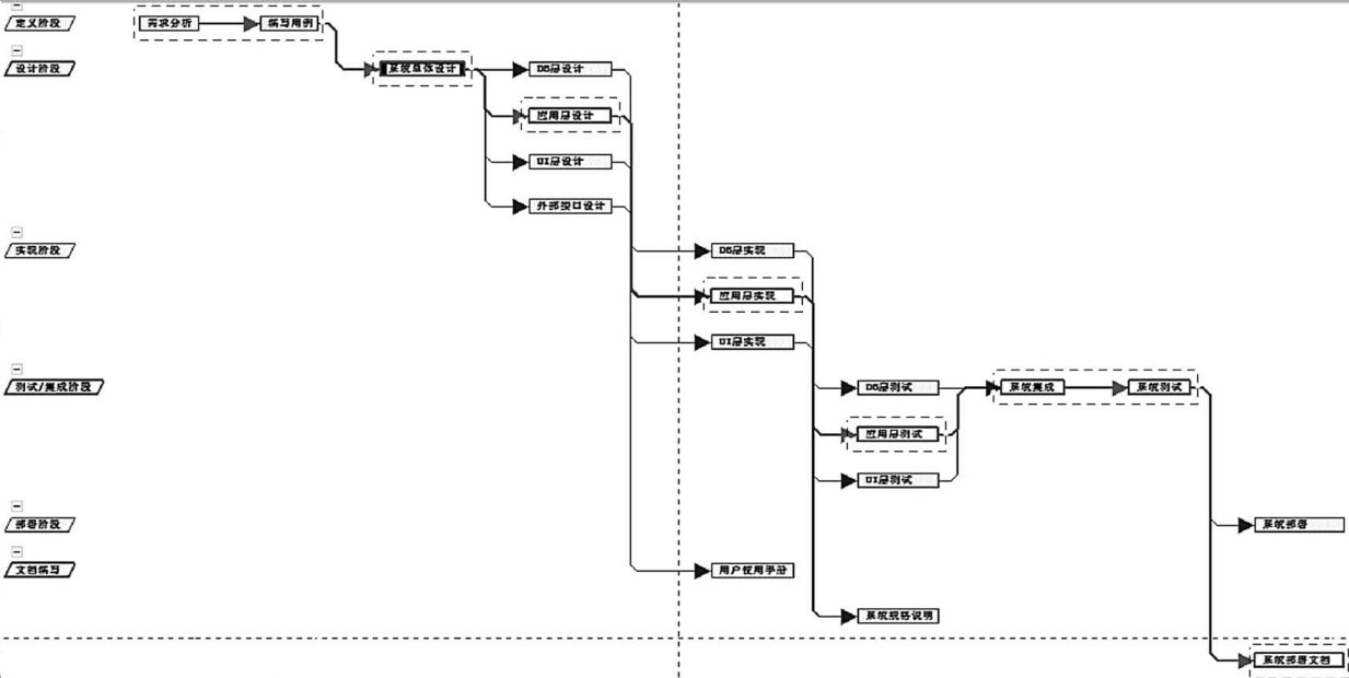 甘特图简单直观,但不适合表达各项任务之间的依赖关系和关键路径。可使用网络图画出各工作任务之间的依赖关系并标出关键路径。