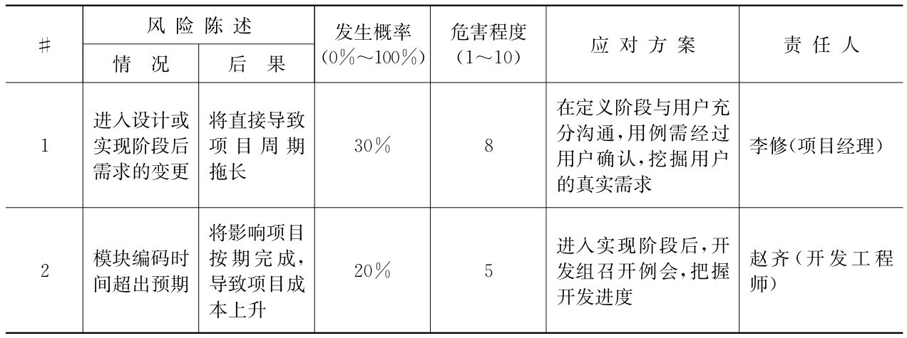 教室预订系统项目的风险列表如表4-4所示。