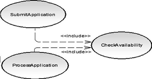 图5-4展示了教室预订系统中一个具有包含关系的例子。在申请者申请预订教室的过程中,通过用例Check Availability检查申请教室的可用性。同样管理员在处理申请时,也可以通过用例Check Availability检查教室可用性。