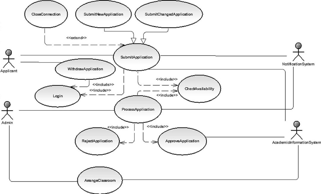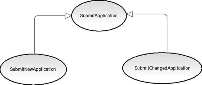 图5-6是教室管理系统中一个具有泛化关系的例子。提交申请用例(Submit Application)是一个笼统的提交申请用例,描述了提交申请的过程。提交一个新的申请(Submit New Application)、提交一个修改预订方案的申请(Submit Changed Application)是提交申请的特殊情况。