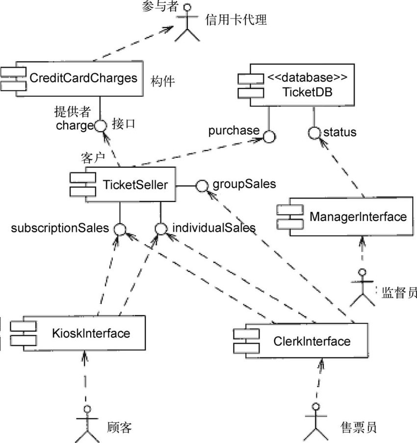针对编译后形成的实际可运行系统,也需要定义一个构件图。图7-8是经过编译后售票系统的构件图。图中有三个用户接口:顾客和公用电话亭之间的接口、售票员与在线订票系统之间的接口和监督员查询售票情况的接口。售票方构件顺序接受来自售票员和公用电话亭的请求;信用卡主管构件之间处理信用卡付款;还有一个存储票信息的数据库构件。构件图表示了系统中的各种构件。在个别系统的实际物理配置中,可能有某个构件的多个备份。