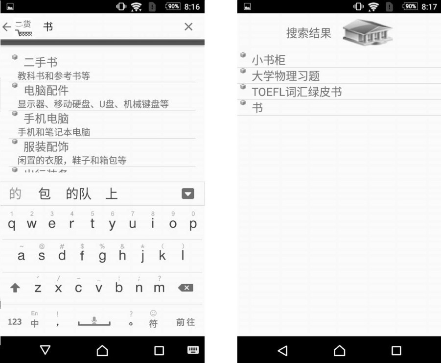 (17)搜索商品:用户在登录成功后,单击左上角“更多”按钮,单击搜索,在屏幕最上的搜索框中输入关键字,单击前往,转到搜索结果列表(见图12-113)。